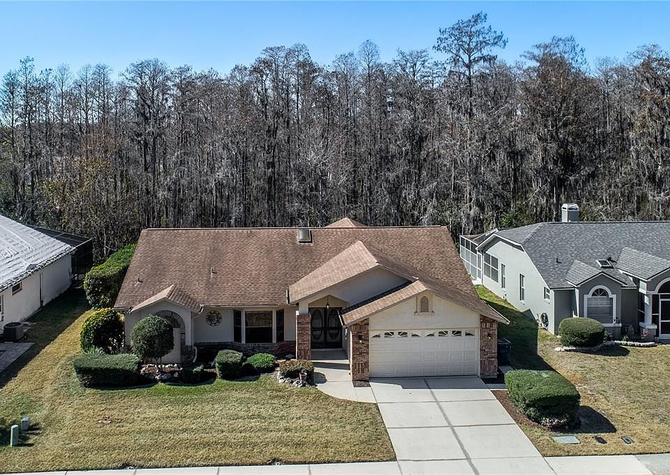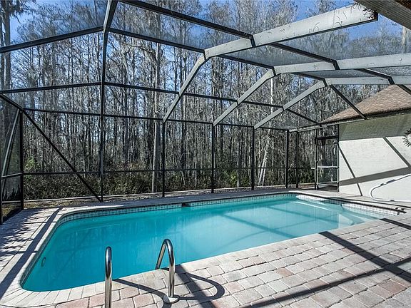 A rare opportunity to own this beautiful pool home in Southern Oaks, offering private conservation views from both the front and back of the home, located on a low-traffic cul-de-sac street. This home showcases 4 bedrooms, 2 bathrooms, and a 2-car garage, along with a private backyard featuring a screened-in lanai, pavered patio, and private pool. Inside, the foyer opens to a formal dining room with a triple bay window, vaulted ceilings, and tranquil pond views. The kitchen features wood cabinetry, granite countertops, a large island, and a stainless steel appliance package. The kitchen flows seamlessly into the family room, which includes a built-in entertainment center, while the secondary dining area opens directly to the pool deck and backyard—ideal for indoor-outdoor living. A guest wing adjacent to the main living area offers three bedrooms, a guest bathroom, and a laundry room. The spacious primary suite includes a large walk-in closet, and the primary bathroom highlights a double vanity, walk-in shower, and garden tub. Additional features include: NEW GAF Dimensional Shingle Roof (2018), laminate plank flooring, upgraded lighting, and a concrete retention wall. Conveniently located near Robert K. Rees Memorial Park with playgrounds, sports courts, walking trails, and picnic areas. Enjoy nearby shopping and dining, with easy access to US-19, the Veterans Expressway, and State Road 52. Zoned for Longleaf Elementary and River Ridge Middle and High Schools.