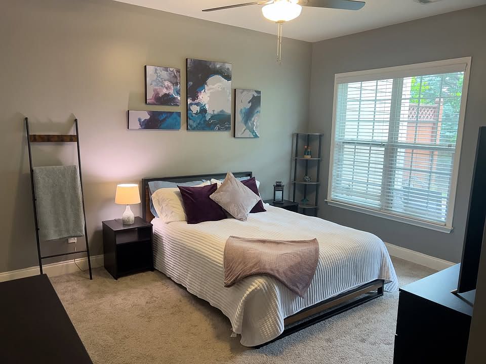 Hello! I am renting out the first floor of my 3-story townhome which is located inside the perimeter near the borders of Smryna and Vinings. This includes a private bedroom with sound-proofed door's that is furnished with a bed, brand new sheets and toppers, two nightstands, a dresser, a bookshelf, a side table, and a 55' 4K Samsung smart TV. The room features high ceilings, a sizeable closet and a lot of natural light, and there is even a private patio attached to the bedroom where you can start a garden if you'd like. The space also includes a private full bathroom and adjacent (shared) laundry facilities. You have access to a large amount of cupboard space in the kitchen and a full range of appliances. Rent is $1150 per month and includes utilities. Background check, proof of income, and a refundable $500 security deposit required. The room is now available for move-in. I look forward to meeting you! 6 - 12 month lease terms. All utilities included in rent. No smoking indoors. No pets. Driveway parking included.