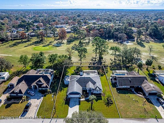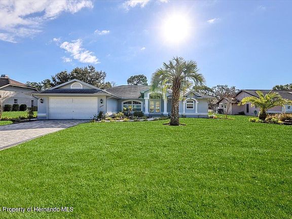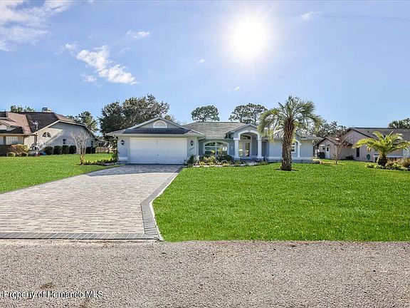Active with contract accepting backups. A fresh start never looked better than this stunning Spring Hill pool home! Sitting on a peaceful cul-de-sac street, look no further than your backyard for sweeping vistas of the Oak Hill golf course. Re-stuccoed and painted in 2015, this beauty's curb appeal is enhanced by newer landscaping and brick pavers in the driveway and front walk (2020). A split bedroom floor plan unfolds from the foyer and double door entry. Newer windows compliment the new doors (2018), which include the front door and the French doors to the lanai. Whether you're hosting this month's book club or an intimate family dinner, the formal living and dining rooms ensure you have plenty of space to entertain. The bright and cheery kitchen is definitely the heart of this home. Cooks will adore the abundance of cabinet space, granite counters, composite sink, and newer stainless steel appliances. Enjoy your morning bagel at the breakfast bar, or sip your coffee in the eating nook, which overlooks the pool area. When it's time for a round of The Game of Things or a streaming binge, gather with your nearest and dearest in the generously sized family room. On cooler nights, you can even snuggle up in front of the feature fireplace. Your privacy is assured in the master bedroom with his-and-hers walk-in closets and direct access to the lanai. Unwind after a long day in the ensuite bathroom, which boasts a large dual sink vanity with a built-in makeup area, garden tub, and separate shower. The two guest bedrooms are quite sizable with plenty of closet space. They share a full bathroom with a dual sink vanity and tub/shower combo. Grab your towel and sunscreen and head outside to enjoy Florida living. Lounge in the shade of the lanai, which had new lighting, fans, and tile added in 2014. The ultimate addition to this home is the screen enclosed in-ground pool, which, along with the brick paver deck, was completed in 2015. Dive on in to cool off during the summer months. The garage has a newer door lift and was repainted in 2017, while a Tuff Shed provides additional storage for your belongings. The water softener and a new roof were added in 2015; the AC was replaced and septic pumped in 2021. There are no HOA fees or restrictions to worry about in this neighborhood. A centralized location in the heart of Spring Hill means that you have access to tons of local amenities, including Delta Woods Park, Weeki Wachee Springs State Park, Stage West Playhouse, Rotary Centennial Dog Park, and the Hernando County YMCA, all of which fall within a 5 mile radius. There are also a plethora of shopping and dining options, including locally owned favorites like Murphy's Market, Turnpike Rest Stop, Caffe Connection, Papa Clyde's Ice Cream, Jam's Cafe, and more. You'll have easy access to both US-19 and the Suncoast Parkway, so Homosassa, Tarpon Springs, Clearwater, and Tampa are all just a short trip away. Don't give yourself a chance to be disappointed - make your offers before this home is sold!