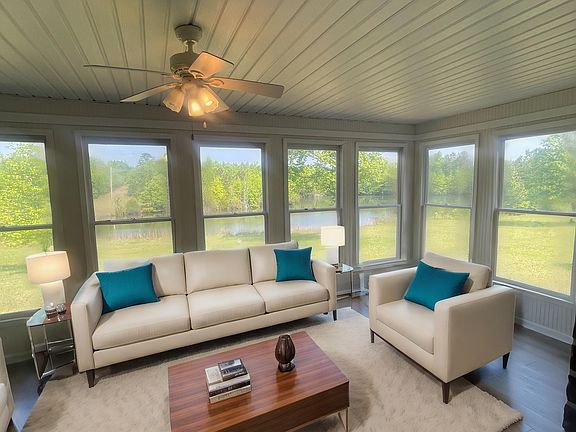 Welcome to your private sanctuary by the lake! This three bedroom, two bath brick home is nestled on a picturesque 64 acre lot with a serene 2+ acre lake. Spacious and light filled living area with a sunroom that has breathtaking water views. Open concept main area with kitchen with new granite counters and ample cabinet space. Split bedroom plan and separate laundry room. Endless possibilities for outdoor activities and relaxation. Enjoy fishing in the private lake, hiking through the wooded acres, or simply unwinding on the porch as you take in the natural beauty that surrounds you. Home has new LVP flooring and all new interior paint. Large unfinished basement with a separate room that could be finished as a bedroom. Also includes a built in safe. Schedule a showing today and experience the magic of lakeside living. Note: Some photos have been virtually staged.