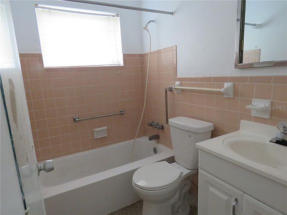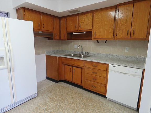 Only a few touches and this gem will be ready to live in. One big step, it will need a new flat roof, which is reflected in the listing price. We have estimates for you. The kitchen has a new counter top and new tile backing for the deep, deep double stainless steel kitchen sinks with the goose neck faucet and sprayer. The original hard wood cabinets are in beautiful condition, with one lower section removed to make way for a modern dishwasher. Gorgeous terrazzo floors, easy to care for, are even in the sun room which boast 3 walls of windows, all in excellent working order. The bathroom was redone a few years ago, with a tub liner, a modern toilet, newer vanity and sink. A stack washer and dryer are in the storage room of the carport to make your life easier. The magnolia tree in the back yard reminds you you are in Florida! Don't let this one get away!