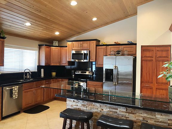 The huge heavy timber walkway entry invites you into this open floor plan 3 bedroom 2 bath with a den/office and 4 car garage! The home sits on a beautifullly landscaped spacious corner lot with only one immediate neighbor. A motorized 25' Brazilian hardwood gate allows private entry and parking into the rear of the home able to park 4 cars and access to the attached back 2 car garage. The back garage is vaulted and perfect for extra cars or small business owner equipment. 100 amp service and built in cabinets and workbench. The front garage is Air conditioned with built in storage cabinets and has a commercial grade epoxy coated floor. The home has large diagonal laid tile in the common areas and tigerwood hardwood floors in the bedrooms. Huge vaulted ceiling in the common area with