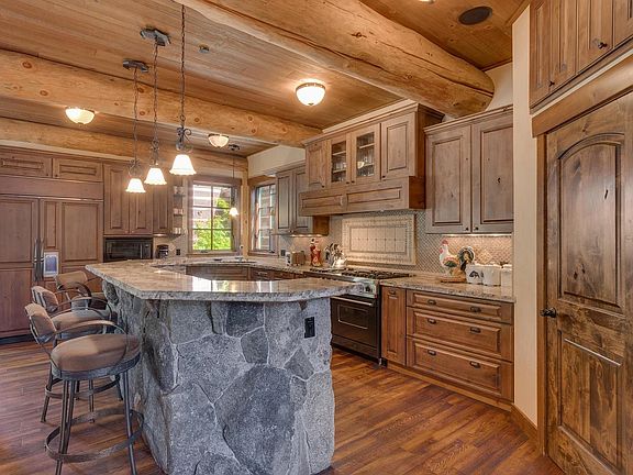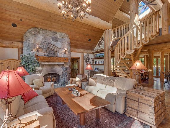 Set across the Truckee River in a private setting, this lodge-style home is ideal year round. In the summer, enjoy the riverfront location and the natural granite walls of Painted Rock. In the winter, this peaceful setting is minutes from world-class skiing at Palisades Tahoe. The handcrafted log timber frame highlights the attention to detail that is found throughout the home. Relax out on the stone patio and enjoy the lush landscaping as you hear the soothing flow of the river over the rocks. Inside, adjourn with your party up the spiral staircase to the recreation room and when it is time to relax, retire to one of the four ensuite bedrooms. There is no better place to enjoy the company of your friends and family.