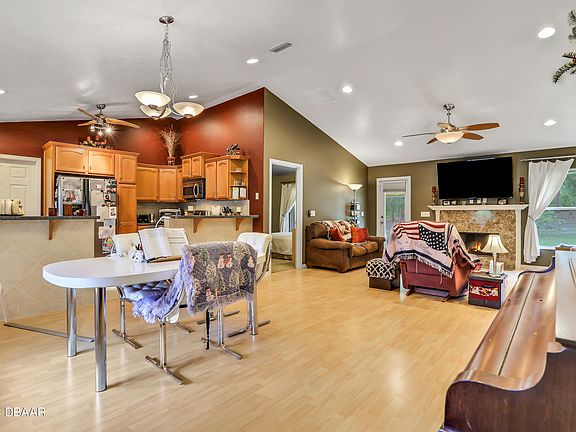 This open concept home is adorned with vaulted ceilings that grace the great room with a wood-burning fireplace, kitchen, and master bedroom.