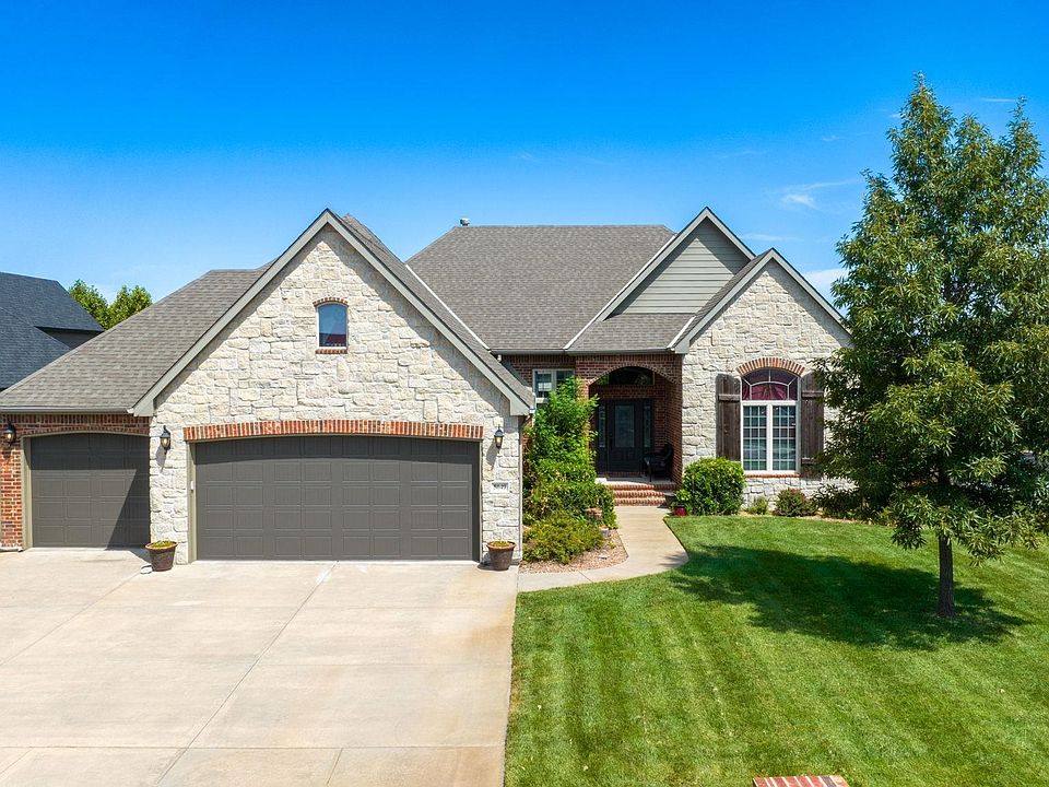 Spectacular stone/brick 5BR+office LAKEFRONT home with 2210sf main+1828 in 9'walkout, oversized 3-car 27' deep, builder's own home with many custom extras including: custom built-ins throughout, solid white-oak flooring in main level living areas, luxury vinyl in entire full walkout with radiant-heated floors in 40' Family/game area, concrete deck (no maintenance!) with large covered outdoor bar and stone firepit, huge dock with private beach area. Class 4 roof, new carpeting in BR's, new luxury vinyl in bsmt (11/22), new dishwasher (8/23) and newer AC unit (Jan '23), 12' recessed-panel ceilings in LR/DR, full granite kitchen with large island and separate serving buffet, sunny breakfast nook and huge hidden walk-in pantry. Spacious Master Suite over 20' with access to covered deck, separate 6' Jacuzzi tub and 4'x6' double shower, peninsula walk-in closet with built-in dresser & shoe racks! Quiet cul-de-sac with NO specials, HOA dues only $15/month, Valley Center Schools and access to beautiful Crystal Lake with over 120 acres and miles of shoreline for your family's enjoyment!