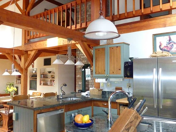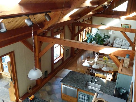 Rustic yet refined home on 9.5 acres Massive beams and meticulous joinery combine in this impressive Timberframed home, garage and outbuilding. Open floorplan with vaulted ceilings & skylights, 3 BR + loft/ 1 full & .75 BA is complemented by v.grain fir doors & wide-board floors & ceilings, gas fireplace. Generously upgraded kitchen shares space with solarium. Walk-in wine cellar, atrium, hobby rm, crowsnest & Laundry. 1+ mi nature trails on prop, adjacent Peach Preserve 2200' beach.