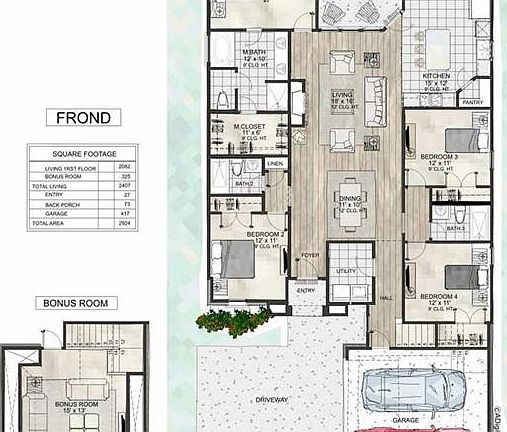 The Frond plan is a 4/3bath with added bonus room, two story home offering open and spacious living areas with 12' high ceilings. Living room is open to dining area with wall of windows to the backyard. Adjacent kitchen with keeping area features chef's island, WiFi smart appliances, gas cooktop, separate wall oven and walk-in pantry. Separate Master bedroom has en-suite bathroom with dual vanities, walk-in shower, garden tub, WC, and walk-in closet. Stone granite counters in kitchen and all baths.
