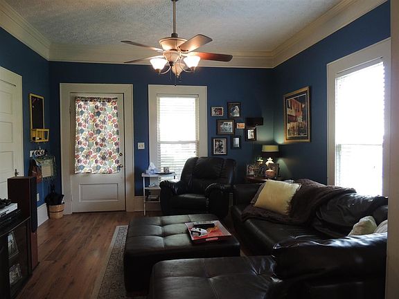 - LIVING ROOM DESC: 9? Ceiling, Crown Mold, Laminate Floor, Ceiling Fan