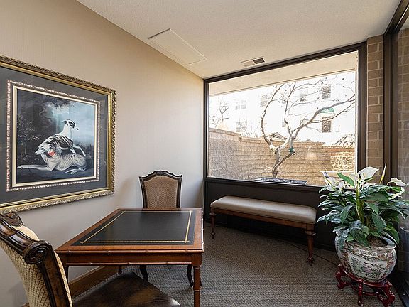 No sign per HOA. Non Smoking building. Updated elevator. All 25 units are owner occupied. 4th floor southern facing condo with treed Grand Ave view. Lovely foyer, tiled floor, display cabinets/dry bar or pantry. Sun streams into spacious living room area featuring oversized walls of windows facing S and SE . Beautiful custom cabinets under south wall. Updated white kitchen. Stainless appliances. Hard surface counters. Main bedroom has a large walk-in closet. (Owner had divided closet space - can easily be opened) 2nd bedroom or study option. Updated bathrooms (3/4 bathrm has walk-in shower). One indoor parking space included. One lge storage closet on ground level. NO Rentals. PETS: total of two (2) dogs or cats 30 pounds or less. PARKING restrictions if more than one vehicle. Two guest suites may be rented for out-of-town guests for a minimal nightly rate. fee. Commercial construction. Quiet and secure. This building is a hidden gem in heart of Grand Avenue/Ingersoll neighborhood. Walk to restaurants, churches and shopping. Convenient access to everything in greater Des Moines.
