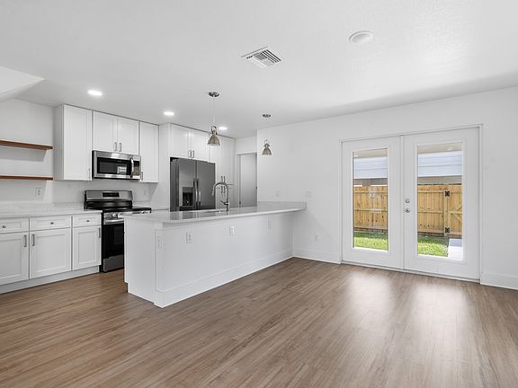 Stylish and spacious first floor: Step inside to wood-like flooring and an airy layout that seamlessly connects the living and dining areas. The gourmet kitchen boasts white shaker cabinets, quartz countertops, a large island, and stainless-steel appliances including a range, refrigerator, microwave, and dishwasher. Just off the kitchen, a dedicated laundry room with washer/dryer hookups adds everyday convenience.