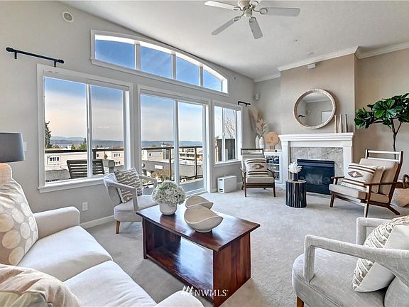 Stunning WATER VIEWS,SUNSETS, FERRY PASSINGS from luxury condo located in the Bowl Downtown Edmonds. Act now; this is the Edmonds location and condo you've been waiting for. This TOP FLOOR corner unit boasts 2 bedroom,2 full BA, water views, natural light & skylights, 9' ceilings, 2 balconies, large walk in shower, soaking tub, spacious DEN w/closet, and an open kitchen with quartz countertop & cherry cabinets. Cozy up by your fireplace, take in views of the Sound. The unit includes 2 parking spots in secure underground garage. Building elevator (no stairs needed). Pet friendly. Bose surround sound system, custom window coverings thru-out, deluxe awning. Walk to award winning restuarants beaches & ferries. Live the Edmonds dream, today!