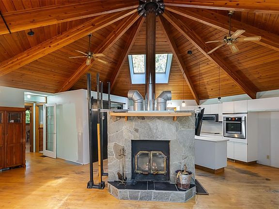 Airy open-concept layoutPost-and-beam accentsCircular vaulted cedar ceilingLarge west-facing deckJetted tubMaple floors