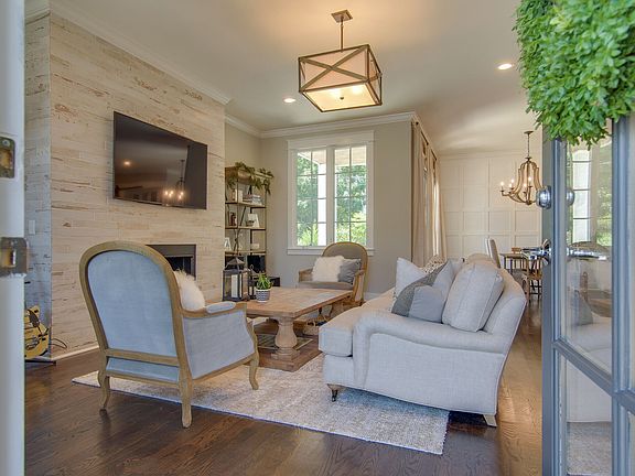 Sophisticated and practically brand new. Wide plank hardwoods. Kitchen with large island and buffet area. Open plan with gorgeous contemporary fireplace. Soaring ceilings. Tall doors and windows. TWO master bedrooms: one up, one down. Second floor den or media room with half bath. Third floor HUGE rec room. W/D and Fridge convey. Epoxy floor in garage. Three covered porches. Stone and timber exterior and low maintenance yard.