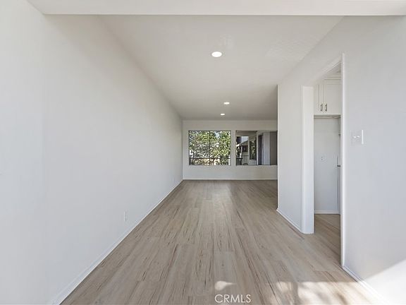 This stylish Long Beach condo offers a private courtyard entry and a bright, welcoming interior. A large wall of glass picture windows fills the living room with natural light, complemented by flush-mount lighting and light-colored luxury plank flooring throughout. An additional panel of windows in the dining area provides views of the neighborhood’s palm trees, while a kitchen serving window makes entertaining easy.