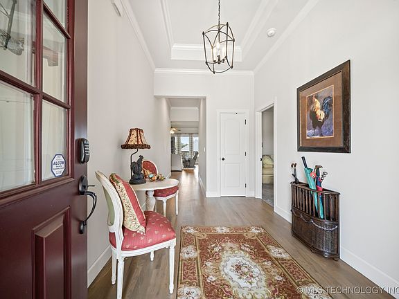 Nestled on a serene greenbelt, this two-year-old home graces an expansive 1/4 +- lot, offering a harmonious blend of nature and elegance. A tranquil pond view adds an enchanting touch to the surroundings. The rear porch, a true sanctuary, overlooks the pond and boasts a wood-burning gas fireplace, inviting cozy evenings. The exterior is a testament to meticulous design, with professional landscaping by Hardscapes enhancing the curb appeal. The single-level layout, owned by a sole homeowner, exudes a sense of comfort and pride. Designer finishes resonate throughout, while traditional hardwood floors in the living spaces infuse timeless charm. An open concept design effortlessly combines contemporary living with classic aesthetics. Tall ceilings amplify the sense of spaciousness, and a substantial quartz island takes center stage in the kitchen, complemented by abundant cabinetry. The living area features a gas-burning fireplace, captivating and inviting. Three bedrooms, including an owner's suite, provide private retreats, and an additional office or flex room caters to versatile needs. Two and a half baths offer convenience and luxury. The interior spaces are designed to capture stunning pond views, accentuating the serenity. The pinnacle of opulence, the owner's suite, indulges with a spa-like en-suite bath boasting a soaking tub and a generous shower. This home encapsulates a harmonious blend of modernity, natural beauty, and refined living, creating an idyllic haven where comfort and style intertwine seamlessly. Dining area curtain toppers stay. Patio is plumbed for a gas grill. Outlet in owners closet. Electric outlet w/i kitchen cabinet which currently houses a printer. Over $20,000 in upgrades post closing, wrought iron fence, extensive sidewalks & professional landscaping. Upgraded tile in all bathrooms, hardwoods, patio fireplace, greenbelt lot w/pond view,