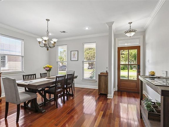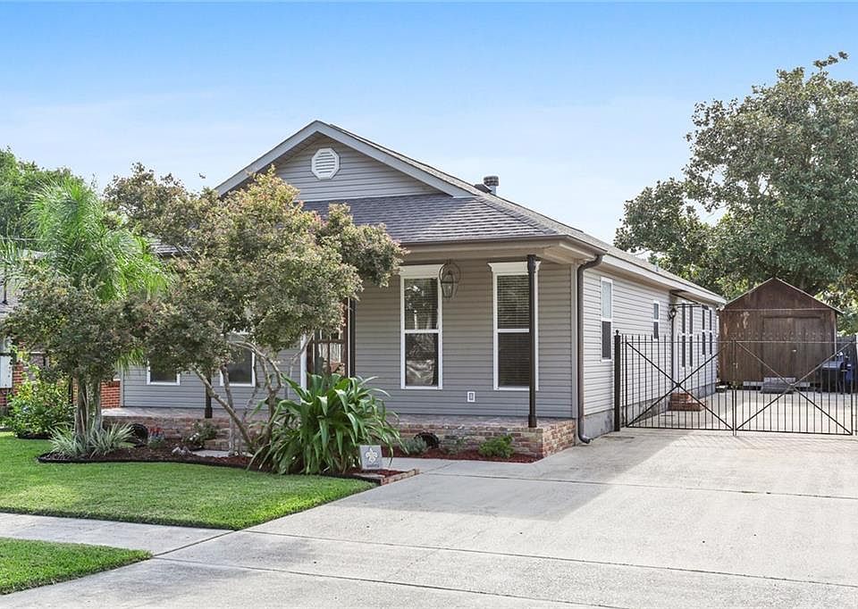 Custom built Metairie home with open living/kitchen, 9 ceilings with crown molding, and Brazilian cherry flooring. NEW heat pump, hot water heater, range, and refrigerator (2 years). Outside living includes front porch with reclaimed Chicago brick & gas lamps and back deck overlooking fruit trees. 12x24 storage shed behind gate & driveway has room for 3 cars (or boat/camper).
