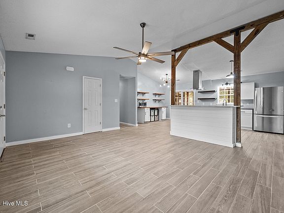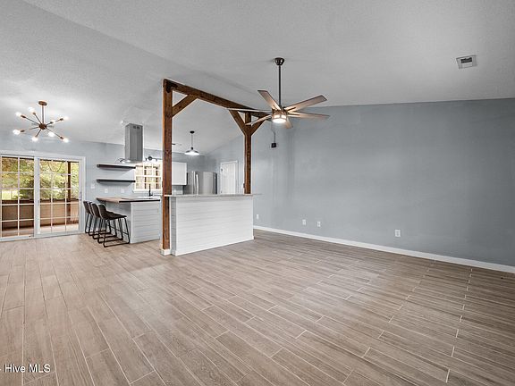 Discover rustic charm in this inviting 3-bedroom, 2-bath home, perfectly nestled in the sought-after Justice Farm community. Located on a quiet cul-de-sac, the property boasts a spacious backyard and exudes a warm, down-to-earth ambiance. Step through the front door into an open-concept living space highlighted by rustic beams and a stylish island that seamlessly connects the kitchen and living room. Down the hall, you'll find the serene master suite, complete with ample storage from two closets, including a walk-in, and a double-sink vanity that adds to the home's welcoming feel. Enjoy peaceful outdoor living on the screened-in porch, overlooking the expansive, fenced-in yard. Ideally situated just minutes from North Topsail Beach and near Camp Lejeune's back gate, this home offers a perfect blend of comfort, convenience, and rustic elegance.