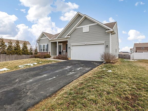 Discover impressive value in this spacious 2,410 sq ft ranch-style home in a vibrant community, built in 2019. Well-designed residence showcases elegant high ceilings and a sophisticated open-concept layout w/ an 11-foot kitchen island seating 6. Versatile front room perfect for office or formal living. Full basement roughed for future bathroom offers expansion potential. 2.5-car garage provides ideal workshop space plus vehicle storage. Outdoor living features a professionally installed paver patio off morning room and securely fenced yard. Located on a quiet street near elementary and middle schools, in an area known for local cafes, dining options, and seasonal community events including farmers markets. Easy Columbus access. This home combines modern features with room to grow.