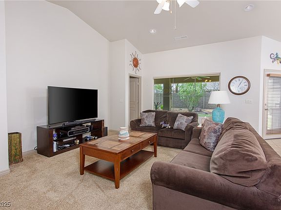 A 4-bed, 2-bath beauty that's cozy enough for naps but fancy enough to brag about. The open layout says 'bring on the good times,' with a kitchen that's a total win: natural wood cabinets, ample granite counter space, stainless steel appliances, under-cabinet lighting & a walk-in pantry with room for snacks and storing all your kitchen gadgets. The breakfast bar seats at least 4-great for PB&J or a toast with friends. The primary suite's your chill zone, with an en-suite that's pure 'ahh'-dual sinks, soaking tub with jets, separate shower and a walk-in closet. 3 extra bedrooms fit kids, grandkids, an office (or 2) or your puzzle table. The backyard's awesome-landscaped, with a patio sporting sun shades, a large mounted TV, furniture, and epoxy concrete. Laundry room? Yep. Natural light and windows? Tons. Near a park with a pond, OHV and bike trails and the Virgin River - a nature perk. Could come furnished so you can just move right in. This isn't just a house-it's your happy place!