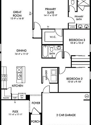 Open kitchen flows to the dining space, great room and outside patio. White cabinets with Simply White Quartz countertops, Skybridge Gray brushed-look tile flooring and multi-tone tweed carpet in our Sleek package.