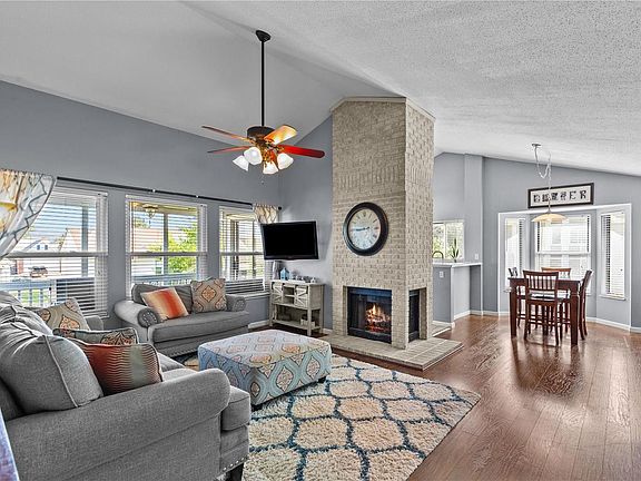 Adorable OPEN PLAN VAULTED ranch with FINISHED WALKOUT lower level & FENCED YARD, walkable to nature trail, Daniel's Farm & high school. Fantastic curb appeal with BRICK FRONT, covered porch, twin dormers, fresh landscaping & 2-car garage. Soaring vaulted great room with WALL OF WINDOWS, brick 2-SIDED FIREPLACE & easy-care laminate plank flooring. Open kitchen with peninsula bar, ceramic tile, dining area with bay window, some STAINLESS appliances (fridge stays) & sliding door to COVERED DECK - ideal for entertaining. Vaulted primary suite with WALK-IN CLOSET, tiled shower. Secondary bedrooms feature CUSTOM CLOSETS & share hall bath with tiled tub/shower combo. Convenient main-level laundry (washer/dryer stay). Downstairs rec room, recessed lights, bonus room with egress, office with walkout to patio, 3rd full bath & generous storage. HVAC & water heater replaced in 2015. Easy access to Highways 70/370, near RecPlex, parks, shopping & more. AWARD-WINNING SCHOOL DISTRICT. Agent owner. Some Accessible Features