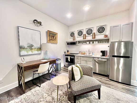 New Winter Rental! Urban, loft-style king suite at the beautiful boutique hotel! The Hive, a boutique hotel nestled in downtown Wilmington, NC, beckons travelers with luxury, privacy, and unparalleled service. Situated in the heart of the vibrant tapestry of Wilmington's attractions, The Hive offers a unique lodging experience that captures the essence of this charming city. No details were spared in this luxury king suite featuring original exposed brick walls, high 12ft ceilings, a modern kitchen with beautiful quartz countertops and stainless steel appliances and a dining table for 4. The inviting living room area has large windows, a leather sleeper sofa with memory foam mattress, and original art throughout! From the large walk-in shower, to the luxury linens and towels, and high-end Charles P. Rogers king mattress, every detail has been meticulously curated in this suite to enhance the guest experience and provide a sense of indulgence and relaxation. This special seasonal rental rate gives you the option to lease this incredible suite from November 1st through March 31st, with a minimum requirement of 30 days! All Utilities, including high speed internet, and fiber optic cable are included. There are two full size W/D on site for guest use. Our guest common area located inside the main lobby entrance includes a spacious area with a couch, club chairs, and dining table, as well as a gym. When you arrive at the property your beds will be made with crisp, fresh linens. We provide you with all you need to start off a relaxing winter rental including bedding, bath towels, travel size shampoo/conditioner /bath soap, cooking and dining essentials including pots and pans, plates, cups, a Keurig coffee maker and starter supply of k-cups and condiments, and a starter supply of dish soap, laundry soap, toilet paper, paper towels, and trash bags. Fees, including a Security Deposit, Sales & Accommodation Taxes, and Cleaning Fees vary depending on the length of your lease. Parking is included. Located in the heart of downtown Wilmington, you will find you are just steps from the best of downtown wilmington, including Front Street shopping, dining & breweries, the Riverwalk, the Wilson Center, Live Oak Pavilion, the Convention Center, Museums, Comedy Clubs, Theaters, and waterfront restaurants and bars! The Hive's urban, loft-style suite promises a delightful blend of comfort, style, and convenience, making it an ideal choice for travelers seeking a memorable stay in downtown Wilmington. Although centrally located, the Hive is perfectly situated in a location providing for natural privacy!