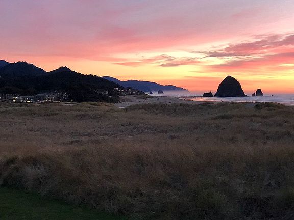 Perfection has a name, and it is Unit 505! This beachfront “end” unit has a private staircase and patio with bench to welcome guests to the front door, with the beautiful dunes located just feet across the trimmed landscape in the back. Haystack Rock greets you when you enter the condo, seen out of the large array of windows in the cozy living room. A large kitchen (with granite island), a powder room, stackable washer and dryer, and ample closet space round out the first floor. Upstairs, a bedroom with a built-in dresser and study area could be for guests, but the real jewel is the master bedroom: tall windows make up two walls, with beautiful, unencumbered 180-degree views of Haystack Rock, the town and Ecola Creek to the left; dunes and the ocean in front of you; and Tillamook Head Lighthouse and the rocks of Ecola State Park to the right. Enjoy the fresh breeze, ocean sounds, and even starry nights on this private, two-sided deck. All bathrooms have custom tiling in coastal colors. If the master is the gem, the space on the THIRD FLOOR is a thing of childhood dreams and architectural ingenuity: three built-in beds, two that lay under three massive skylights that can open on sunny days to get a sea breeze, see the Rock, or even stargazing. The large space also boasts many built-in drawers, shelves, and a study desk. Round out the room with a half-bath (with its own skylight!), and you have the perfect escape for kids after a busy day at the beach or clubhouse indoor pool.