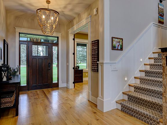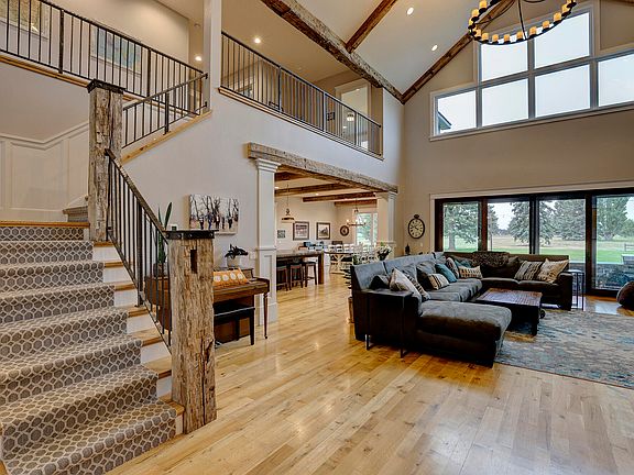 The main floor's great room features abundant natural light, an exquisite, massive stone wood burning fireplace, white oak flooring and beautiful unique light fixtures can be found throughout the home. Reclaimed hand-hewn beams from a 1900's dairy barn in Wisconsin adorn the ceilings of the living room, kitchen and dining room. The grand stairway posts were also repurposed from the same barn and were combined with custom made iron railings to complete the look.
