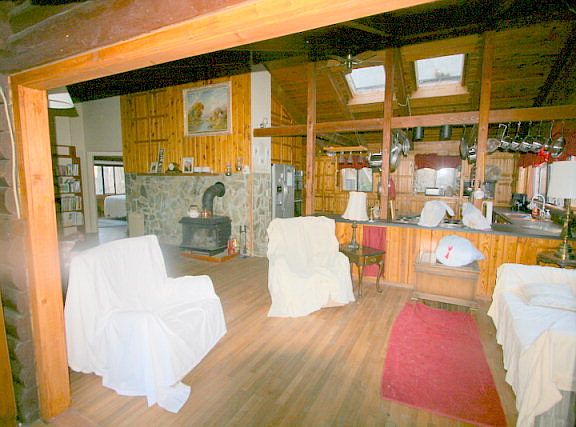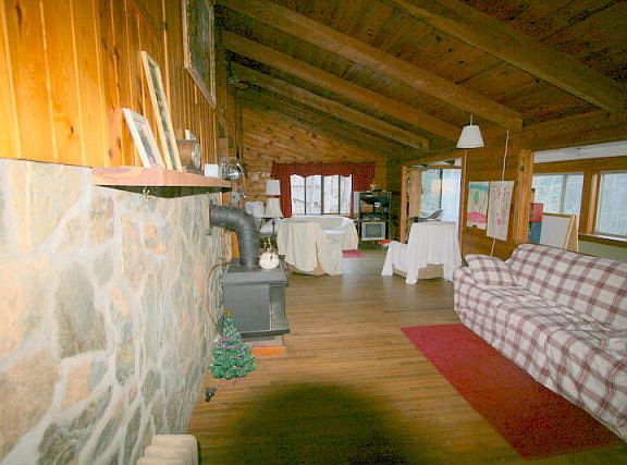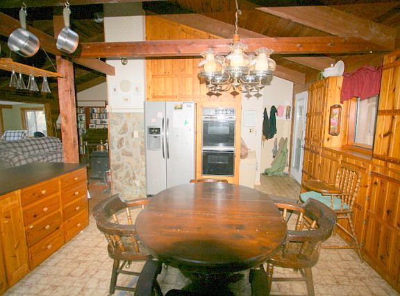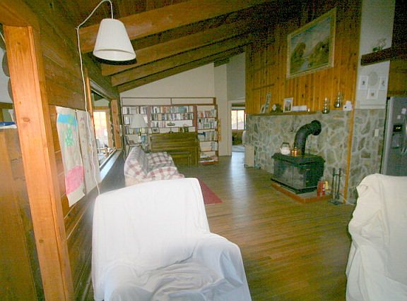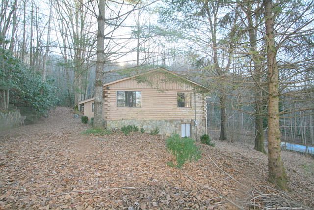 SEASONED LOG HOME ON 15.6 wooded acres with old barn, in ground pool (in need of repair), creek flows through property, USFS adjoins this private retreat with 2 bedroom 1 bath upstairs - potential of 2 other bedrooms and bath downstairs, rooms already partitioned, den or family room there also plus storage, large enclosed sunporch upstairs for multi-usage. Beamed ceiling, wood burning stove on rock hearth adds to charm, small pond on the property.