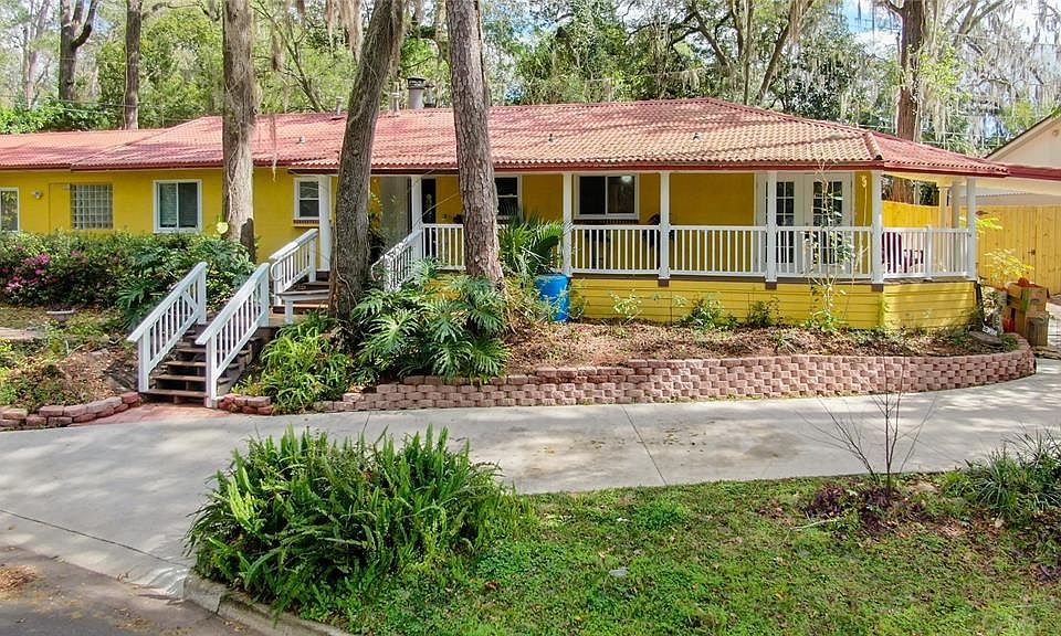 Location! Location! Location! Walk to UF Law School or campus from Historical Golf View Estates home surrounded by UF Golf Course. This unique home boasts 5 bedrooms and 3 full bathrooms. Home can be sectioned off with in-law suite with 2 bedrooms, 1 bathroom, kitchenette, large living room and private entrance. This lovely home has remodeled kitchen with 2 large pantries, SS frig, Bosch dishwasher, convection oven, eat-in table and bar counter with pass through to family room. Relax with friends and family in spacious great room with wood burning fireplace with large newer double paned windows with beautiful view of privacy backyard. Gorgeous travertine floors 2016 with Schluter system too. Other upgrades include new tankless hot water heater, 50 YEAR metal tile-looking roof, new pex water lines 2022, 9 new windows 2022, and new HVAC 2023. Your guest will love their bedroom with private bathroom with jetted tub. Open and spacious enclosed, heated/cool sunroom great for relaxing and reading. Multiple decks great for BBQ and wrap around front porch both with view of natural landscaping and fruit trees. Great home for entertaining, gator games and tailgating. Entry gate at backyard is shared with UF campus. Gainesville is known for its preservation of historic buildings and the beauty of its natural surroundings. Home has been a successful Airbnb.