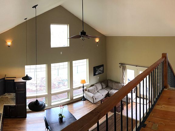 Interior all brand new in 2017- high quality kitchen with soft-close drawers and granite tile with full-tiled backsplash, all new stainless steel appliances, all new tiled bathrooms, laminate and hard wood flooring, new doors and trim, custom crafted distressed wood and wrought-iron banister, dramatic black marble entryway, soaring 20' vaulted ceiling in the great room, wall of windows which face north so the light is always good but never glaring sunshine, upstairs loft area that could be an office or craft area (9' by 13',) second floor vaulted master bedroom with ceiling fan, two large bedrooms downstairs (10' by 15' and 12' by 11',) central HVAC that was new in 2006 but never used until 2017, pellet stove in the basement, laundry area in the basement, double doors from the basement to a walk-out ramp to the back yard, high-end black chain-link fence around half of the back yard, access to the rest of the back yard via a gravel road, Grass Valley Creek flowing through the back yard with a foot bridge crossing over it, vintage garage with metal roof for plenty of extra storage.