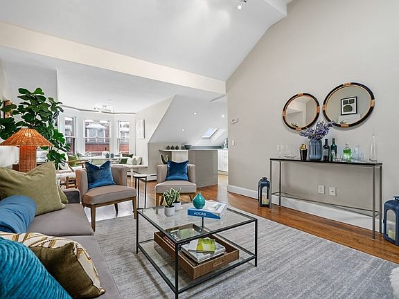 Loft-like two bedroom penthouse with exceptionally high ceilings (nearly 12 feet!) and an open layout in a classic South End townhouse. The well-designed floor plan with hardwood floors throughout is filled with sun. The stylish kitchen features vented cooking, a Bosch dishwasher, ice-maker and a breakfast bar for stools. The dining area has a bay window and banquette for plenty of seating and the very large living room has soaring vaulted ceilings and skylights. The two bedrooms have substantial closets and dramatic views of the Back Bay skyline and sunsets. The brightly updated bathroom has a sleek vanity with great storage and large but-in medicine chest mirrors. There is comfortable hot water baseboard heat and central air-conditioning. The new common Samsung washer and vented dryer is normally shared with only one other owner (two of the four units have private laundry). Charming and well-maintained common areas and a fully owner-occupied building complete this lovely home