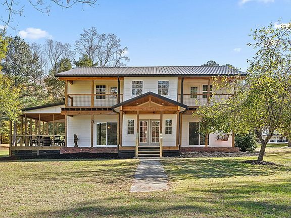 Originally built farmhouse, circa 1937, is fully restored. This approximate 4,300 SF lakefront home has five bedrooms, four bathrooms, two offices, an unfinished basement, four porches and four balconies each offering spectacular views. Mechanical, electrical, plumbing were replaced in 2020. Roof and exterior siding were replaced less than 6 years ago. Two 200 amp panels have been added with additional amperage feeding the exterior. The unfinished basement is perfect for canning and storage. An open floor plan on the main level is perfect for entertaining. The easy flow between the kitchen, living room with oversized fireplace, dining room and 16 x 32 back porch offers ample room for friends and family to gather. Enjoy the walk-in pantry, laundry room, and bathrooms for every bedroom. Two bedrooms are on the main level while three additional are on the second level. The master bedroom has 'his' and 'her's' walk-in closets, a private porch, an en suite bathroom with a double tile shower, separate tub and double vanities with granite counters. Enjoy privacy, room to roam, lakefront views, ponds to fish, land and to hunt and four wheel.