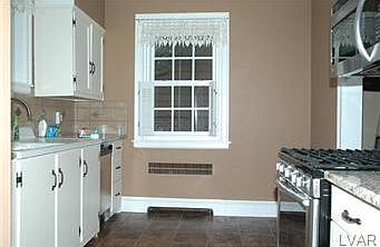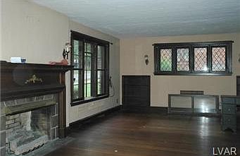 Charming 3 bedroom Tudor Home in the Wyomissing School District. Living room with hardwood floors and stone fireplace.