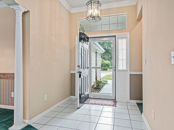 Discover the charm of 505 Wildflower Trail—an expansive single-story residence featuring a thoughtfully designed 3-bed, 2-bath split floorplan. Nestled strategically beside the 15th hole of the esteemed Myrtle Beach National Golf Course, this home ensures tranquility away from golfers' tee shots. Step inside to find pocket doors seamlessly connecting the spacious living room to a large kitchen, boasting abundant natural light and ample storage—a perfect setup for hosting gatherings. Crown molding runs throughout the main living areas and primary bedroom. The oversized garage offers shelving and additional storage space above, catering to practical needs. Located in the desirable Southcreek neighborhood, known for its minimal HOA fees and excellent amenities such as a pool and picnic shelter, this property promises both comfort and convenience.
