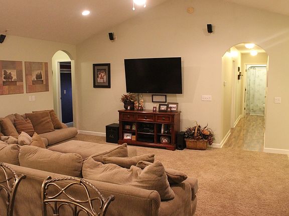 Amazing custom built home on 2.58 acres. 5 bedrooms on the main floor and an open floor plan. Many material upgrades throughout this home including arched living room doorways, cathedral ceilings in the kitchen, living room and dining room, wired surround sound in the living room, stainless steel appliances and ceramic tile flooring in the kitchen, custom built-ins in the bedrooms, wood blinds that stay with the property, a huge master suite with a claw foot tub and a large pole building. Many mature trees surround the back acreage and provide a nice private setting. Very peaceful. Welcome Home!