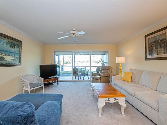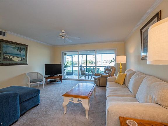 Water views will wow you the moment you step inside! Overlooking a large golf course pond, you'll have a front row seat to watch golfers and wildlife from your large screened lanai. Inside is a COMPLETELY remodeled 2 bed/2 bath TURNKEY FURNISHED condo! A light and bright kitchen features new soft-close cabinets, granite counters, subway tile backsplash, stainless appliances and LED under cabinet lighting. Accents include crown moulding in the main living area, 6 inch baseboards and framing around the sliders. Split layout for privacy and spacious bedrooms. The master bedroom features views of the water and a new door out to the lanai. The stunning ensuite master bath was just completed with a new walk-in shower, dual vanity with quartz top, tile plank flooring, new mirrors, fixtures and new soft-close cabinets. The guest bath features a new vanity with granite counter and hardwood cabinet and matching mirror. New diagonal tile flooring in kitchen, dining and baths and new carpet in bedrooms and great room. Full-size washer and dryer and lots of closet space. And new hurricane-rated sliding doors AND windows throughout. Ground floor means no stairs or waiting for the elevator!