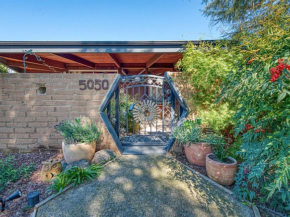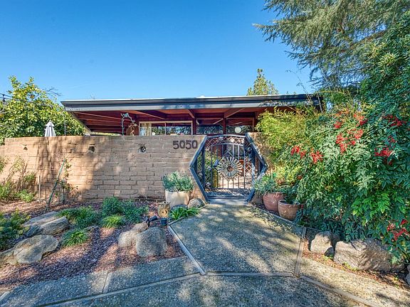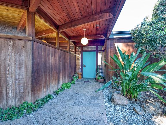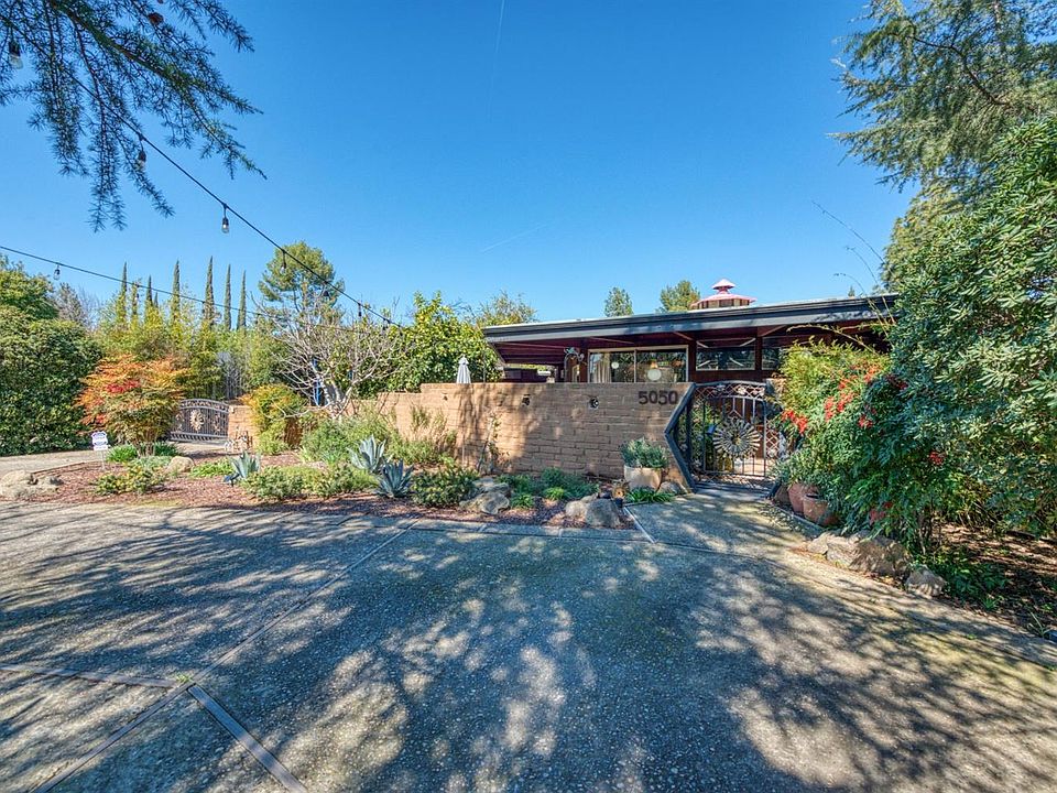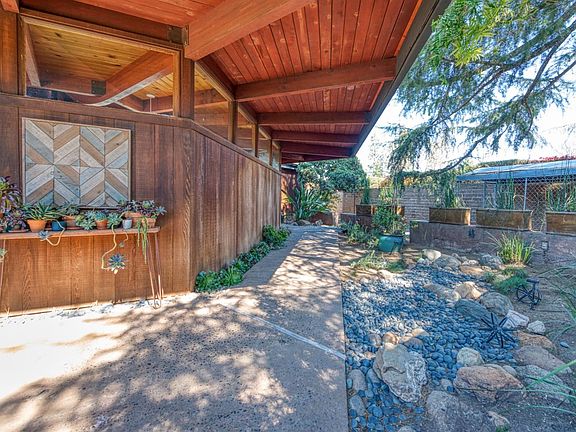 Mid Century Modern 4 bed, 21/2 bath home designed by James Oakes AIA, the only known residential mid modern eligible for Historic Designation in Fresno. Tucked into a cud de sac off Van Ness extension. You enter the home into a hexagon living room that is a work of art. Soaring beams, hex stained glass skylight with a free standing fireplace, glass walls looking out to private patios and view to the beautiful back yard and pool. The kitchen has expansive counter space. Beyond the pool there are lovely stone pathways, great seating and fire pit area, beautiful landscaping. This is a wonderful unique home.