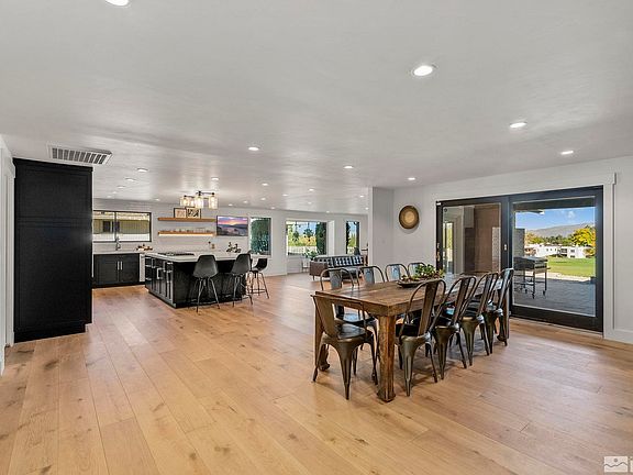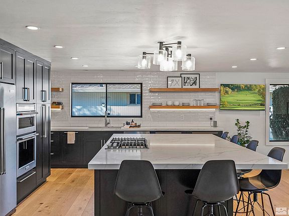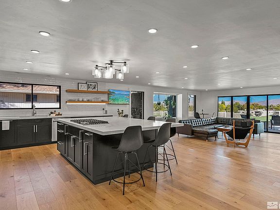 Assumable loan at 2.375% available to a qualified buyer!! This stunning home is ideally located on the 9th hole of Lakeridge Golf course. In addition to being fully renovated, the modern floor to ceiling windows highlight the exceptional views and expansive patio. Entertainers will love the many areas that are perfect for socializing. The kitchen has been completely updated with sleek new cabinetry, gorgeous countertops, including an enormous island, new fixtures, and a classic subway-tiled wall., A double sided fireplace separates the dining and one of two living areas and provides a unique focal point in the heart of this exceptional home. The large bedrooms and bathrooms have also been updated in cool, modern tones. The primary bedroom features golf course views and and direct access to the backyard. Outside you'll find a spacious covered porch and an expansive paver patio that is perfect for entertaining guests or simply taking in the golf course and mountain views. The lawn is ideal for yard games or sitting around a fire pit in the cool Reno evenings. With no HOA, this home provides a country club lifestyle in the heart of SW Reno.