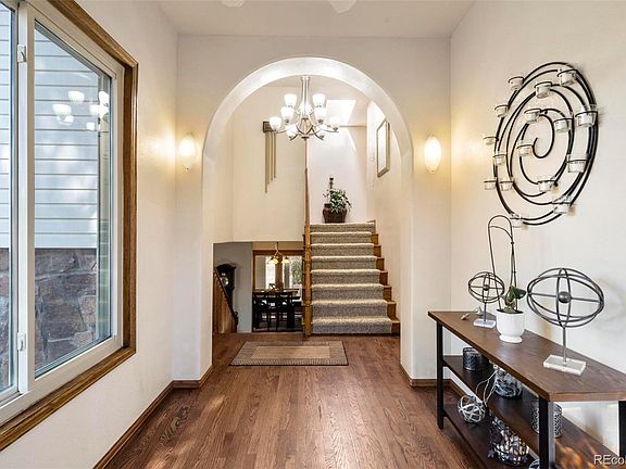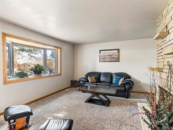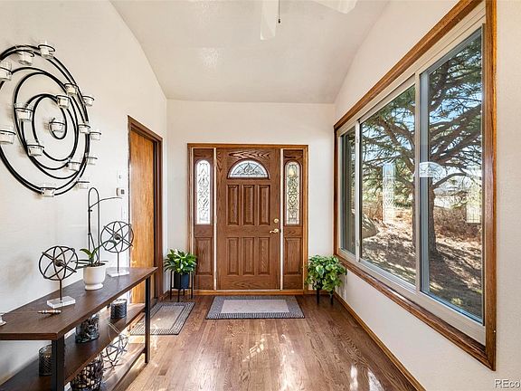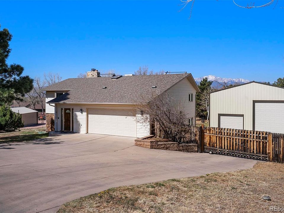 This custom contemporary home has it all!Located in popular Park Vista Estates(county zoned and taxed!),this .77AC lot is so usable.Views of the Peak and Front Range abound from the house and surrounding patios and decks!Almost new, is the RV Warehouse.It's fully contained with a bathroom, office and lots of room for your RV and other toys!It has a built-in dump station, water connection and electric outlets for your convenience!This homes' floorplan offers extreme versatility. The open and light foyer with gleaming red oak flooring,welcomes you in.Continue into the inviting living area with bay window and ornamental fireplace.The Gourmet/country kitchen is perfect for preparing meals or entertaining.Granite tile countertops, red oak flooring, upscale appliances,an island and a wood-burning heating stove complete the kitchen proper,while the adjoining dining area has lots of room for a dining suite and has a walk-out to the sunroom.A secondary bedroom with 2 large closets and full bath complete the main level.The generously sized master suite provides ample room for all your furnishings.The primary walk-in closet adjoins the bedroom.The Master bath integrates into the suite with a spa shower, water closet,2 vanities and a secondary closet.Another secondary bedroom and full bath with skylight completes the upper level.There's even a secret space that has unlimited potential. Formerly used as a play room for the kids,this area is carpeted and has tons of storage capability.The basement is finished with an office and family room with gas-log fireplace.Updated with some new carpet and some new paint and newer windows, this home is move-in ready!You'll be on City water and County septic and there are even some solar amenities.The new enclosed sunroom is perfect for cooler days.Patio areas with gazebo and stamped concrete, as well as a wrap around deck, provide ample places to enjoy the Colorado sunshine.Watch the deer wander by and enjoy a bit of the country in the city.
