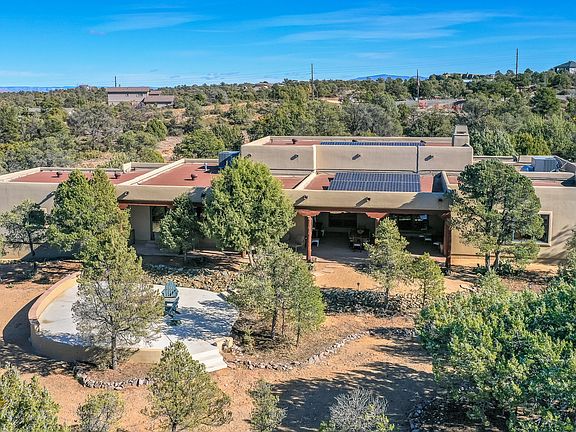 Custom designed Santa Fe style home on 5.28 acres. Enter through gated courtyard to covered porch entry leading into the great room. High ceilings with wood beams, peeled pole columns and clerestory windows. Flagstone floors, and views out to the large 700+sqft covered back patio along with uncovered patio with firepit - Perfect for entertaining. Privacy surrounded by beautifully manicured grounds. Gourmet kitchen with wet bar, wall oven and warming drawer. Large office that could be converted to bedroom. 3 kiva fireplaces, surround sound, solid wood doors throughout, granite & travertine countertops. Spacious 3-car garage. Solar installed in 2016 through Sun Run, paid in full by owners. 2 Heat Pumps installed in 2016, Propane for cooking, fireplaces and outdoor firepit.