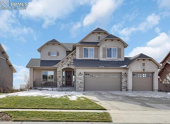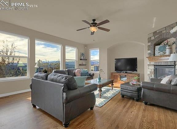 Located in the highly desired Cordera neighborhood, this incredible Saddletree home is tucked away on a quiet cul de sac street yet remains close to so much. The open concept main level boasts gorgeous hardwood floors throughout and the spacious kitchen has it all! Beautiful rich dark wood cabinets, granite counters, a walk in pantry, and stainless appliances; including a built-in oven and microwave, counter top gas range, and even a pot filler faucet for extra convenience. Open to the kitchen is the spacious Great Room with large windows, a view of Pikes Peak, and a cozy gas fireplace with stone surround. The Main level also has a half bath, mudroom, and a lovely formal Dining Room. Upstairs features three secondary bedrooms, the laundry room, a full bath, and a spacious Master Suite complete with an inviting sitting area with built in bookcases. The amazing views (hello Front Range), custom electric blinds, 5 piece en-suite, and large walk in closet add to the retreat feeling in this bright space. The walkout lower level has 9' ceilings, wall to wall built in bookshelves (a readers dream), and a generous sized Rec Room with ceiling mounted built in surround sound speakers-ready for movie night! A fifth bedroom, full bath, and three closets for extra storage complete this level. Enjoy outdoor living (and the VIEWS!!) when dining outside on the covered deck or kick back and relax on the concrete patio below. Walk to both Chinook Trail Elementary and new middle school CTMS; as well the Cordera Clubhouse! Conveniently located close to walking trails, parks, hospitals, dining, shopping and more. Look no further-Welcome Home!