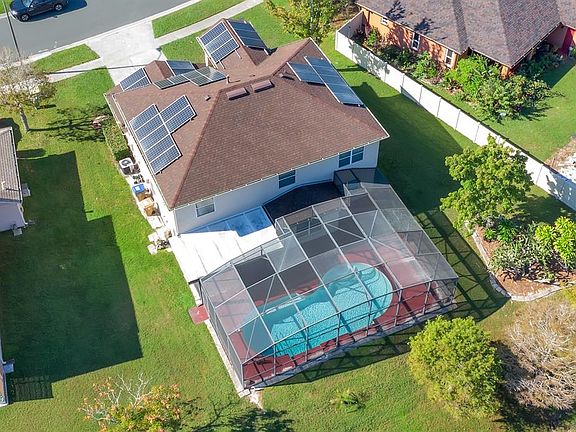 This immaculate two stories four bedroom, three bath, two car garage is listed to sell. This home is open concept, with two living rooms, all bedrooms upstairs, and a beautiful screened in pool overlooking your own oasis with a relaxing pond behind. The appliances are gas, with a brand new dishwasher, ring cameras and floodlight plus new nest smart thermostat. The electric runs approximately $35 a month, with full solar that will be paid off in full at closing. NEW ROOF 2023 - AC 6 years old - Water Heater 7 year old. This home is only 13 miles away from Disney close to the airport and shopping centers.
