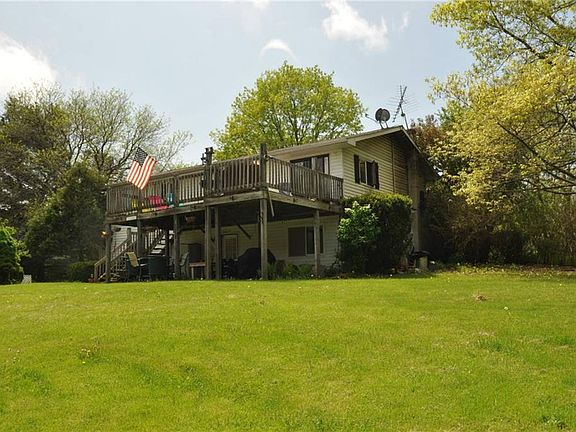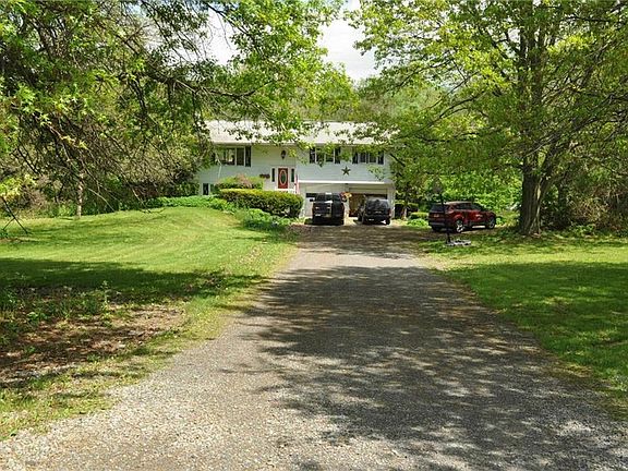 Sitting in the midst of privacy is this wonderful 3 bed/2 bath home complete with an additional 1 bed/1 bath apartment, providing additional income. New Laminate flooring throughout the home gives this open floor plan an updated feel. Kitchen with breakfast bar and eating area has sliders to the large deck overlooking the 2.75 acres with a 4 stable horse barn, pasture, and 333 feet of Taughannock Creek waterfront with deep swimming holes and pebble beach. Plenty of garden space along with fruit trees making this property your small homestead possibility. Barn offers area for chickens or small farm pet. 1 car attached garage and long driveway for plenty of parking.