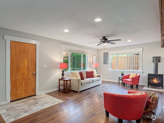 This charming Birch Bay home is ideal for a vacation home, vacation rental property, starter home or downsizer home. Most of the home is freshly remodeled, including new exterior paint, new kitchen countertops, farmhouse sink and range. The open concept living space is full of natural light. Two free standing stoves, one natural gas in the living room and the other is a wood stove in the large primary bedroom. The backyard is generous with a brick patio and plenty of room for dogs, gardening and hobbies. There is a lean-to off the home for storage and an additional covered workspace in the backyard. Just minutes from the waterfront at Birch Bay, this home comes with a common area with private beach rights for homes in Halverson Estates.