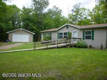 Secluded lot and newer manufactured home on full foundation near Big Lake. Spacious floor plan, nice kitchen with oak cabinetry and built-in hutch, covered screened deck. Walk-in closets in all bedrooms. Large detached garage. Adjacent 1 acre lot available. Access to 100's of acres of Chippewa Forest.