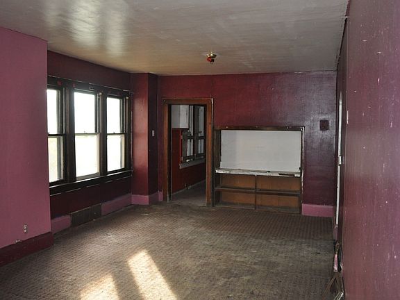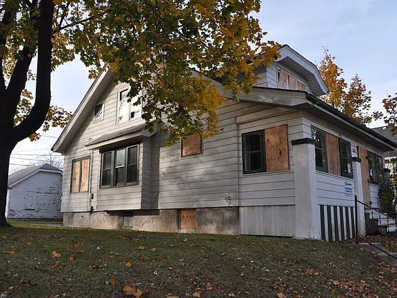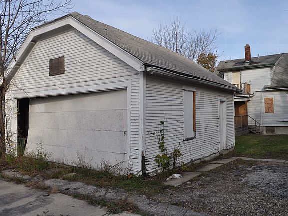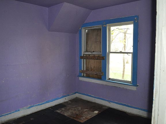 Exterior Features: Single family house,empty lots on both sides. siding coming off in back. Foundation looks solid.Windows are intact some are board ups. Soffits and eaves intact.Front porch,roof looks worn. Two car garage in back door off track, small deck off the house. Interior Features: Living room and dining room is reddish in color tile floor.Kitchen is reddish orange dated couple of cabinets.Two bed rooms on the first floor 1st is purple with tile floor 2nd is blue walls are in good shape.Up stairs is a nice sitting area green with blue trim.3rd bed room is pink and hot pink trim hardwood floor 4th bed room is white with brown trim. In the back on the 2nd floor is a sink and some cabinets that leads out two small deck.Basement is clean electric has fuses,hot water tank,furnace present.
