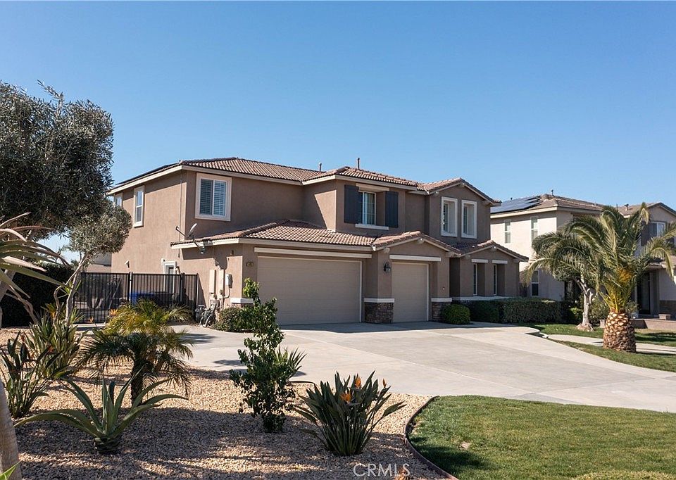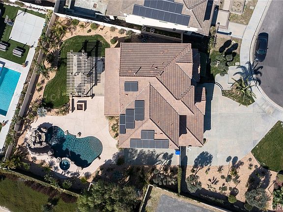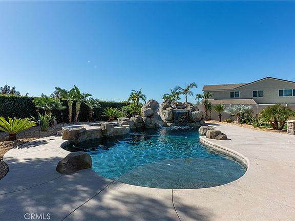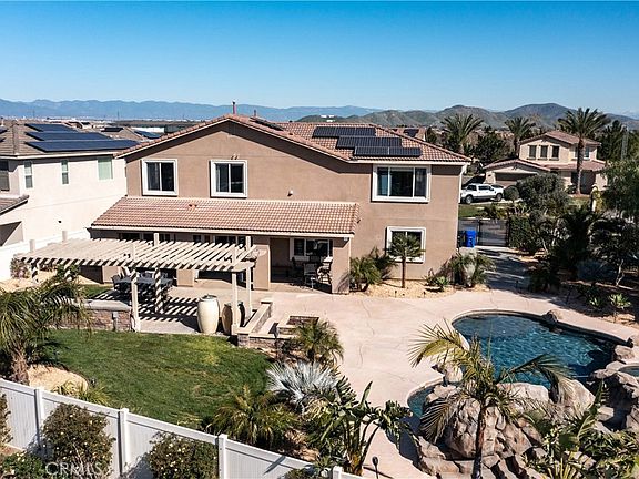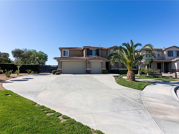 This was one of the model homes for the Turnleaf community when it was built in 2015, since then the owners put in a entertainers backyard! Truly the backyard is what dreams are made of! Huge pool with baja shelf, Jacuzzi, rock slide, built in firepit, covered BBQ area and a covered area with fireplace and TV. This home is light, bright and airy with high ceilings, custom flooring and some of the best built in features a home could have. From the moment you drive up to the home on the large cul-de-sac you will notice the abundance of driveway parking, the 3 car garage and even the RV parking behind the gates. The welcoming entry leads to the downstairs bedroom (currently being used as a pool table and entertaining room with a walk in closet. The large family room opens to the dining area, with built in cabinets, and large kitchen with a massive island and lots of counter space. The kitchen is a dream for a gourmet cook with a six burner gas cook top, builtin refrigerator and stainless steel appliances. The kitchen overlooks the huge backyard as the home sits on a 15,681 sq ft lot. The upstairs has 4 bedrooms, a large laundry room and an upstairs bonus room, currently being used as a personal gym. Three of the bedrooms have walk- closets and have lots of natural light. The master bedroom is expansive with a private suite with separate shower and baths, dual sinks, separate commode and huge private closet. The home has solar that is paid off so the new owner will reap all the benefits of the power production. There is a large tankless water heater and back up battery power pack in the three car garage. This home is centrally located near the 15, 60, 91 and 10 freeways for easy access for any commuters. The neighborhood has large parks with lots of activities and a highly rated K-8 Academy within a five minute walk of the home. Located near local restaurants, stores, and community events. Amazon has a distribution center within two miles of this home. Easy access to the desert, mountains or beaches. RV parking behind a gate and also RV hook ups, truly this is the home for someone who has all the toys and wants to store them on premises.