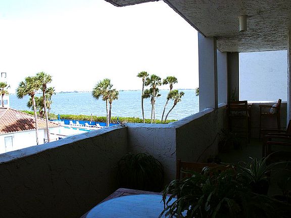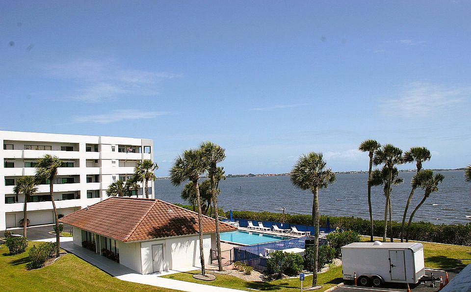 Waterfront resort-style living with deeded boat slip. Beautifully remodeled 2 bedroom, 2 full bath condo with open floor plan that includes: a private hot tub off the primary bedroom suite, new kitchen appliances and tankless hot water heater. Spacious kitchen with double oven and large quartz countertops is made for cooking and entertaining. An outdoor deck wraps in front and on the side overlooking: the water, the pool and the tennis/pickleball courts. The stacked stone backsplash and accents are timeless. Amenities include: clubhouse, tennis / pickleball court, heated pool (cooled in summer), hot tub, sauna, fitness room, and fishing pier. Internet, cable, water, trash pickup, recycling and lawn care are all included. Entry to the building is gorgeous with lush plants and a two-tier fountain with stairs or elevator. Easy access to Rte 1, 95, downtown Melbourne.