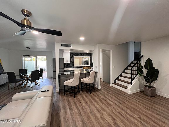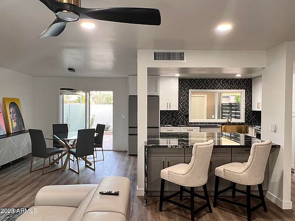 Contemporary tri-level patio home in a great Scottsdale location. Five-minute drive to Old Town Scottsdale, restaurants, bars, shopping, galleries. Walking distance to Chaparral Park, Chaparral Lake, and Green Belt! Home has been completely remodeled, new appliances. Four bedrooms with custom closets; two bathrooms. NO carpet in the home, laminate flooring throughout. Great covered patio for entertaining. Two private covered parking spots and plenty of public spots in front of the unit. Furnitures also for sale on a separate bill of sale.